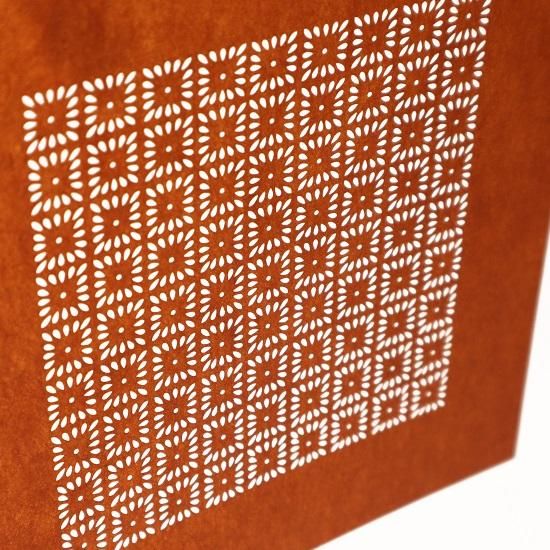 型彫師という職人が、和紙を加工した丈夫な紙に、緻密な文様や図柄を彫刻刀で彫って作ります。細かいもので一寸(約3cm)角に900 以上もの紋様を彫り抜くというから驚きです。