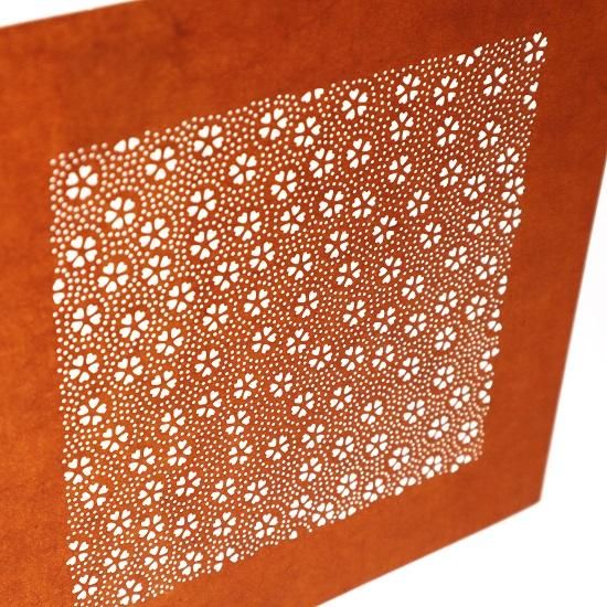 型彫師という職人が、和紙を加工した丈夫な紙に、緻密な文様や図柄を彫刻刀で彫って作ります。細かいもので一寸(約3cm)角に900 以上もの紋様を彫り抜くというから驚きです。