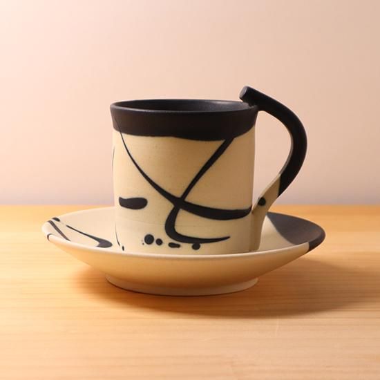 白いマットな質感と、墨のような黒の絵付けのコントラストがキリッとシャープなカップ&ソーサーは、コーヒーが良く映えます。