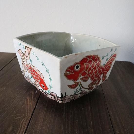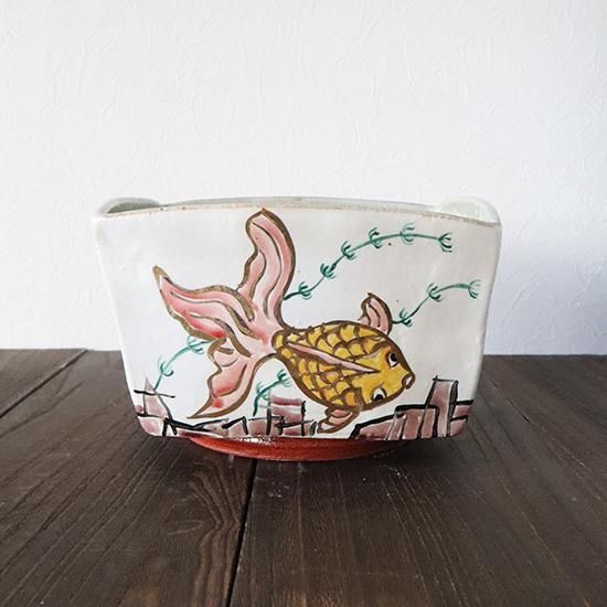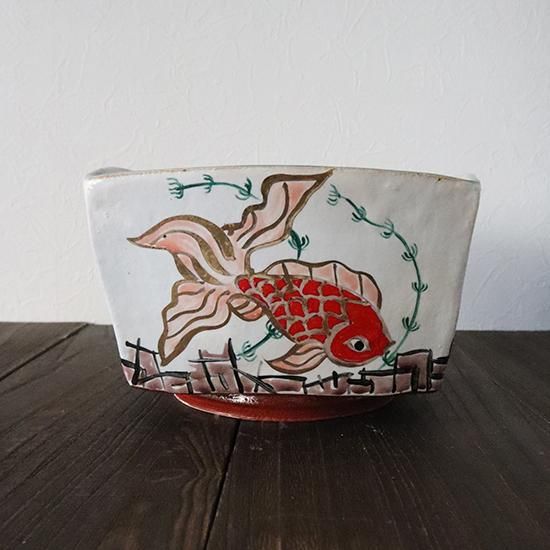 こちらは、四面にそれぞれ個性的な金魚が生き生きと描かれた、ひと際存在感がある大きな角鉢。