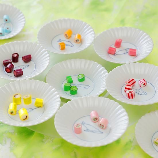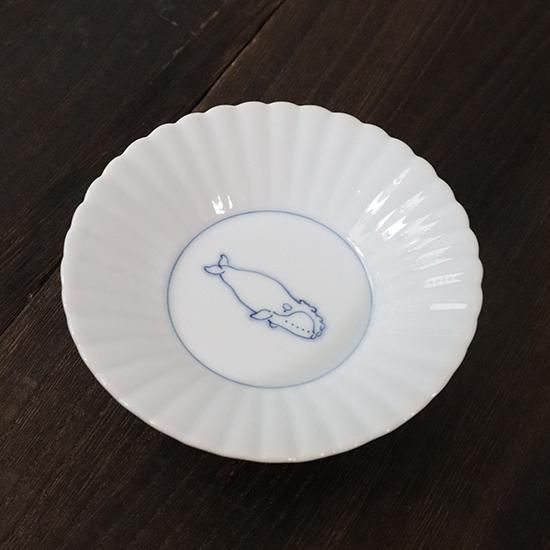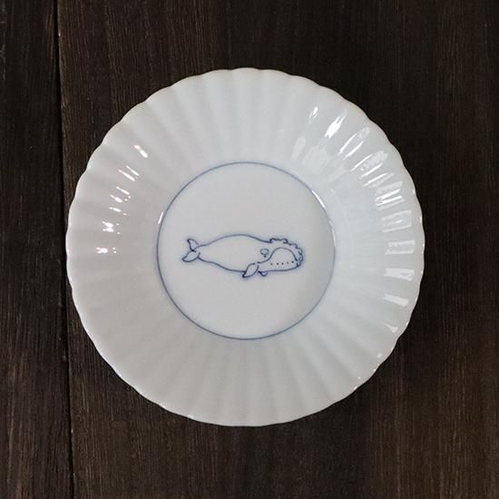 白磁に呉須(ごす)という青い染料で、愛らしいクジラが染付けされた、三川内焼の小皿。