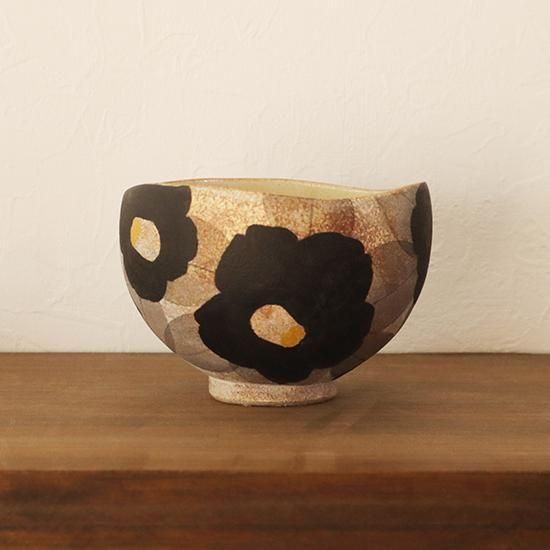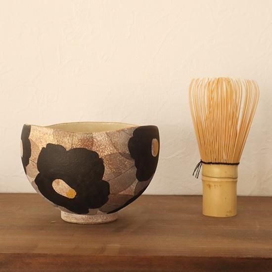 こちらは、モノトーンに金彩を施した椿の抹茶碗。