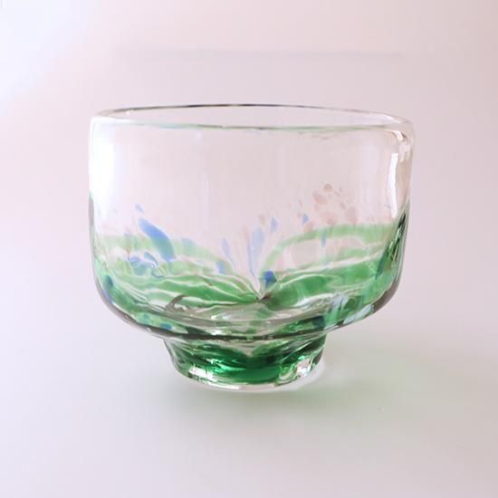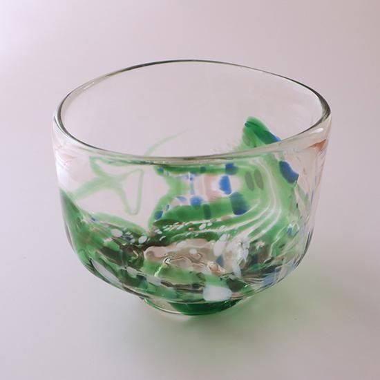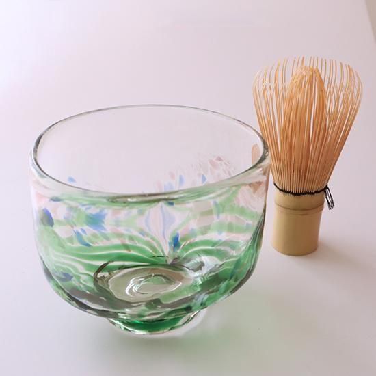 緑色の彩色が大胆に入ったガラスの抹茶茶碗。